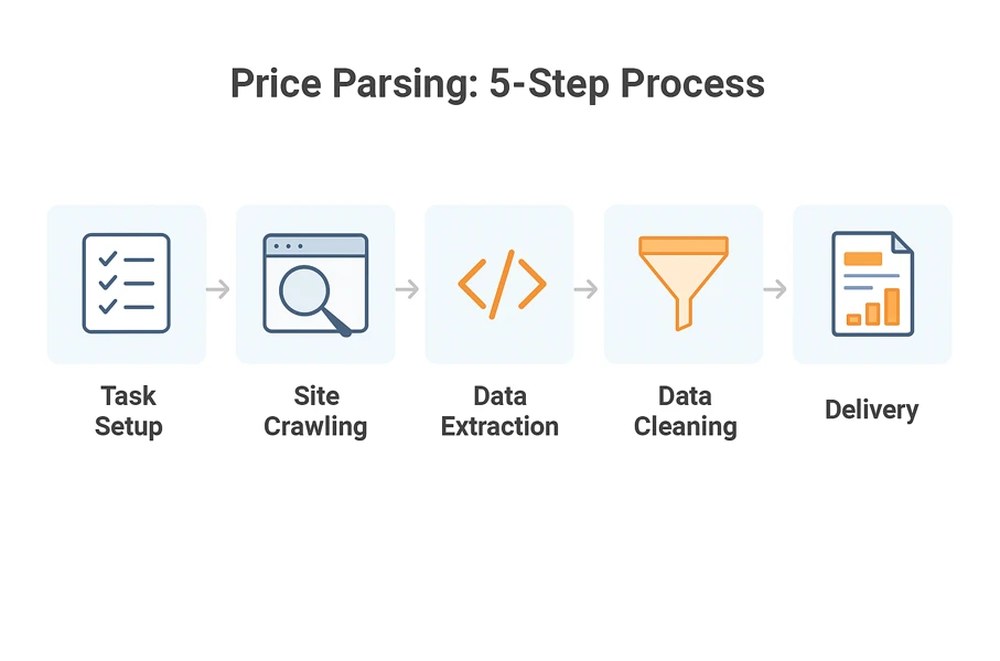 Парсинг — это автоматический сбор данных с сайтов. В нашем случае, это сбор информации о ценах товаров в интернет-магазинах. Система “ходит” по страницам, как обычный пользователь, но делает это быстро и в большом объёме. А затем выдает вам аккуратную таблицу с ценами, SKU, скидками и прочими деталями.