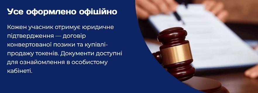 1. Договір конвертованої позики – один з юридичних механізмів оформлення взаємодії з платформою. Взаємодія оформлюється відповідно до умов договору, після чого передбачена можливість конвертації у токени. Це дозволяє визначити порядок взаємодії та фіксації прав учасників при отриманні токенів.