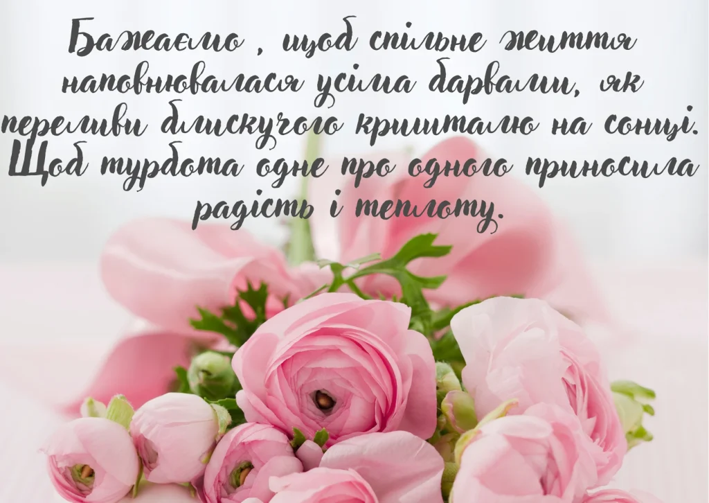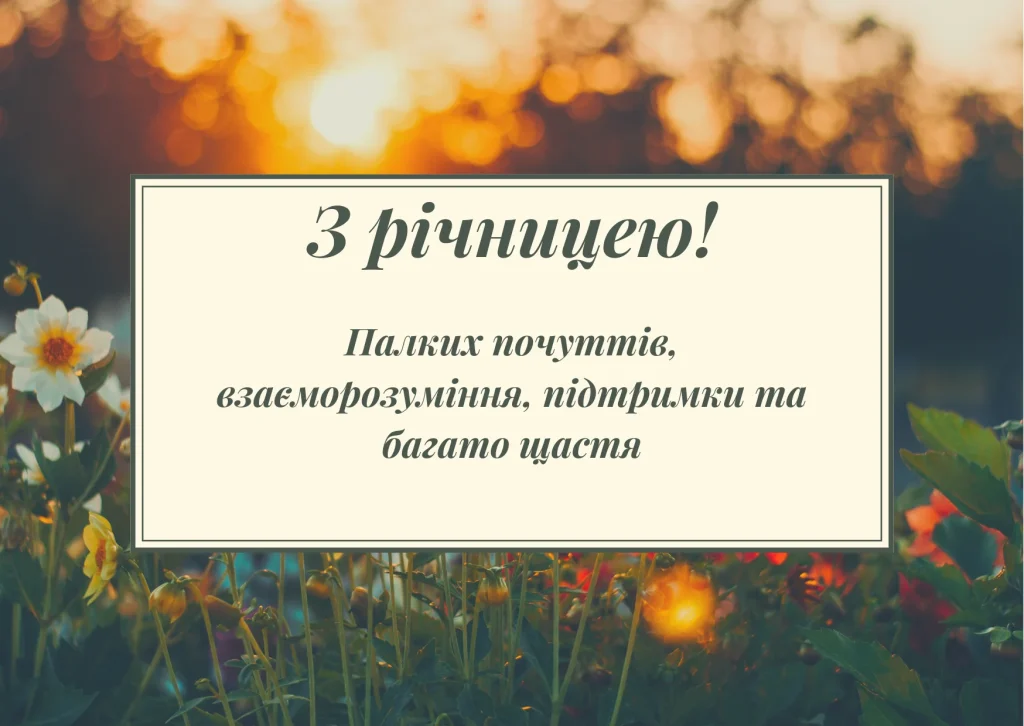 Річниця весілля – чудовий привід нагадати подружжю, як вони важливі один для одного і для всіх навколо. Оберіть одне-два побажання, додайте особисті слова чи спогад – і ваші вітання точно запам’ятаються. Нехай кожна сім’я буде щасливою, а любов – вічною!